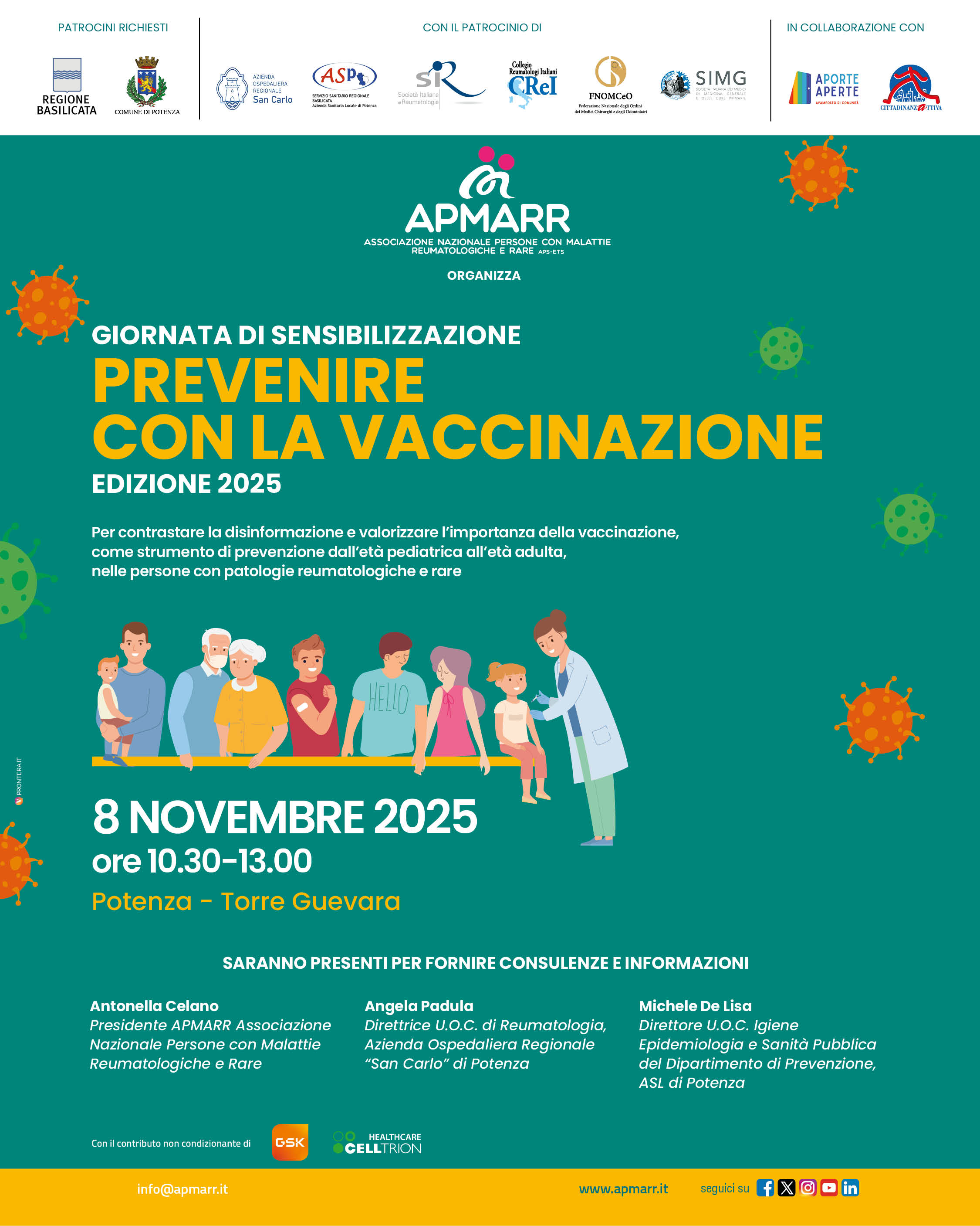 È questo l’obiettivo della mattinata di sensibilizzazione, organizzata e promossa da Apmarr Associazione nazionale persone con malattie reumatologiche e rare con l’Azienda ospedaliera regionale San Carlo di Potenza, e con la collaborazione, per l’accoglienza dei pazienti, di Cittadinanzattiva-Tribunale per i diritti del malato e di Associazione italiana disabili del progetto A Porte Aperte, che si terrà sabato 8 novembre dalle 10:30 alle 13:00 nei locali dell’Aor San Carlo situati a Potenza nella piazza della Torre Guevara. L’appuntamento è una nuova tappa locale del progetto “Prevenire con la vaccinazione edizione 2025”, avviato nel 2024 da Apmarr a livello nazionale e dedicato all’informazione e alla sensibilizzazione delle persone con patologia reumatologica sull’importanza della vaccinazione e realizzato con il contributo non condizionante di Gsk e Celltrion healthcare. Nel corso della mattinata saranno presenti, per fornire consulenze gratuite e informazioni: Antonella Celano, presidente Apmarr; Angela Padula, direttrice della Reumatologia dell'ospedale San Carlo e Michele De Lisa, direttore della Igiene epidemiologia e sanità pubblica del dipartimento di prevenzione della Asl di Potenza.